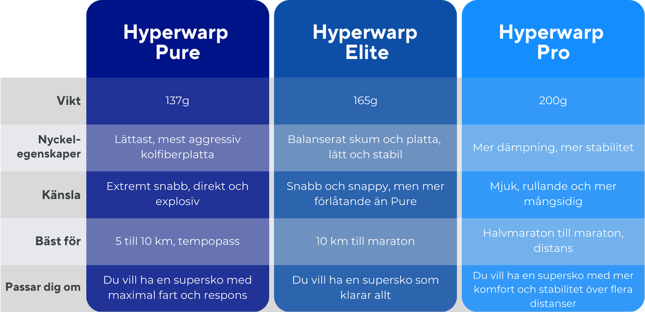 Hyperwarp Elite passar många. Den är fortfarande tydligt racingfokuserad, men med mer komfort och lite mer stabilitet än Pure. Den fungerar även bra för tempopass och hårdare träningspass.